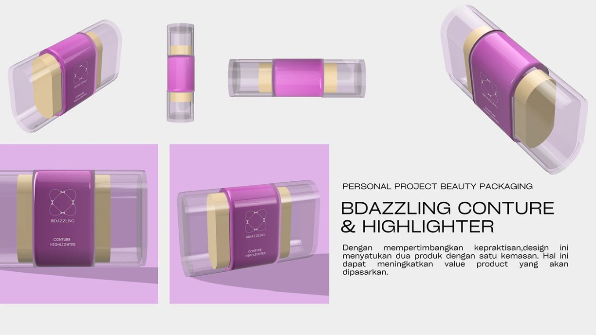 BDAZZLING Conture & Highlighter is a self-initiated packaging study: two twist-up sticks, contour and highlighter, housed in a single slim horizontal case. The brief was mine. The question was whether two products used in the same gesture could share an object without compromising either.